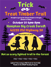 Hampton Lumber and the Clatsop chapter of Oregon Women in Timber invite you to bring your littles (pre-k - 5th grade) out to the Hampton Big Creek Tree Farm on Friday, October 31st from 4pm-9pm! We are lighting up over 900ft of a 'not so scary' forest trail for little ones to grab some treats, hot cocoa & apple cider. Each child will also go home with a free book courtesy of the SMART reading program!